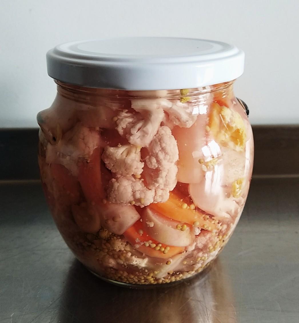 Ingrédients: choux fleurs blancs et jaunes, chou romanesco, carottes,oignons, eau, vinaigre blanc, sucre, sel, graines de moutardes, poivre noir, clous de girofle, piment de Jamaique
