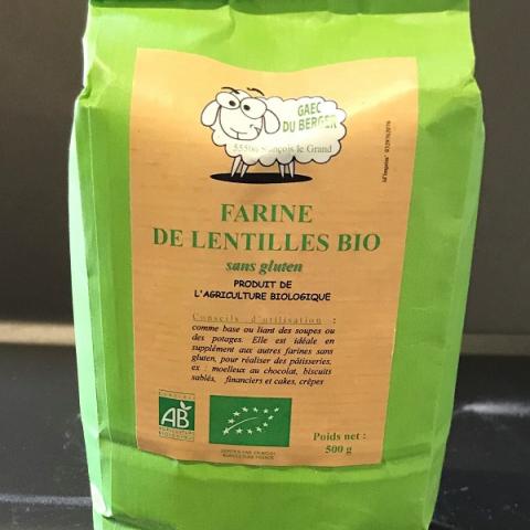 Farine de Lentilles Du Gaec du Berger, semi complète type T80, réalisée avec un moulin en pierre de type Astrié, ce qui garde toute la saveur de la lentille et permet de réaliser des pâtisseries sans Gluten