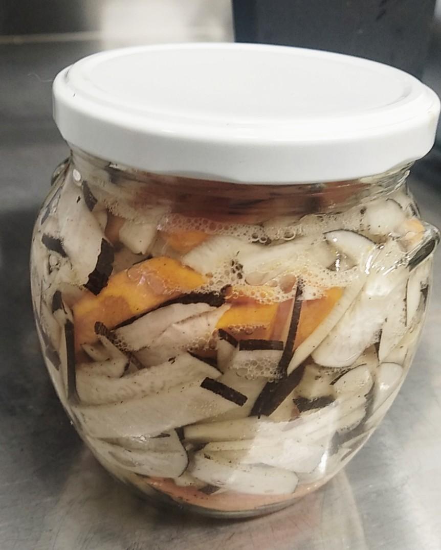 Ingrédients: radis noirs, eau, vinaigre blanc, sucre, sel, graines de moutardes, poivre noir, clous de girofle, piment de Jamaique (quatre épices)